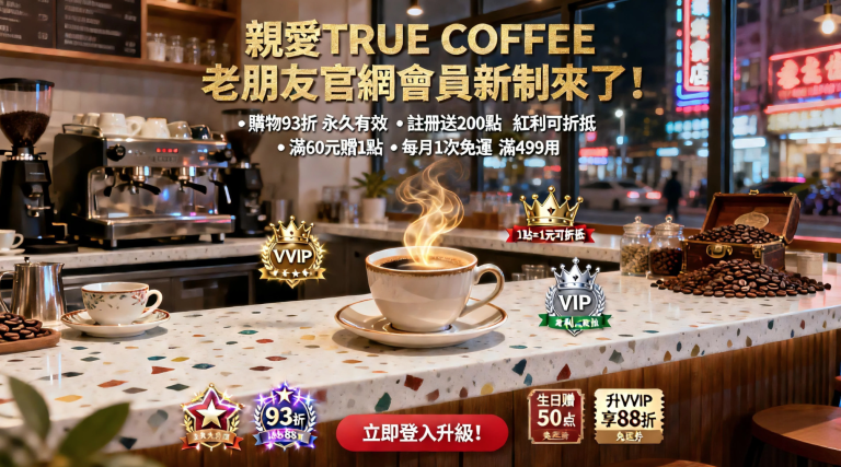 各位忠實會員,您好!感謝您一直支持 TRUE COFFEE板橋專賣咖啡店! 為了回饋您的熱愛,我們全新升級 官網會員制度,讓每位會員輕鬆享&